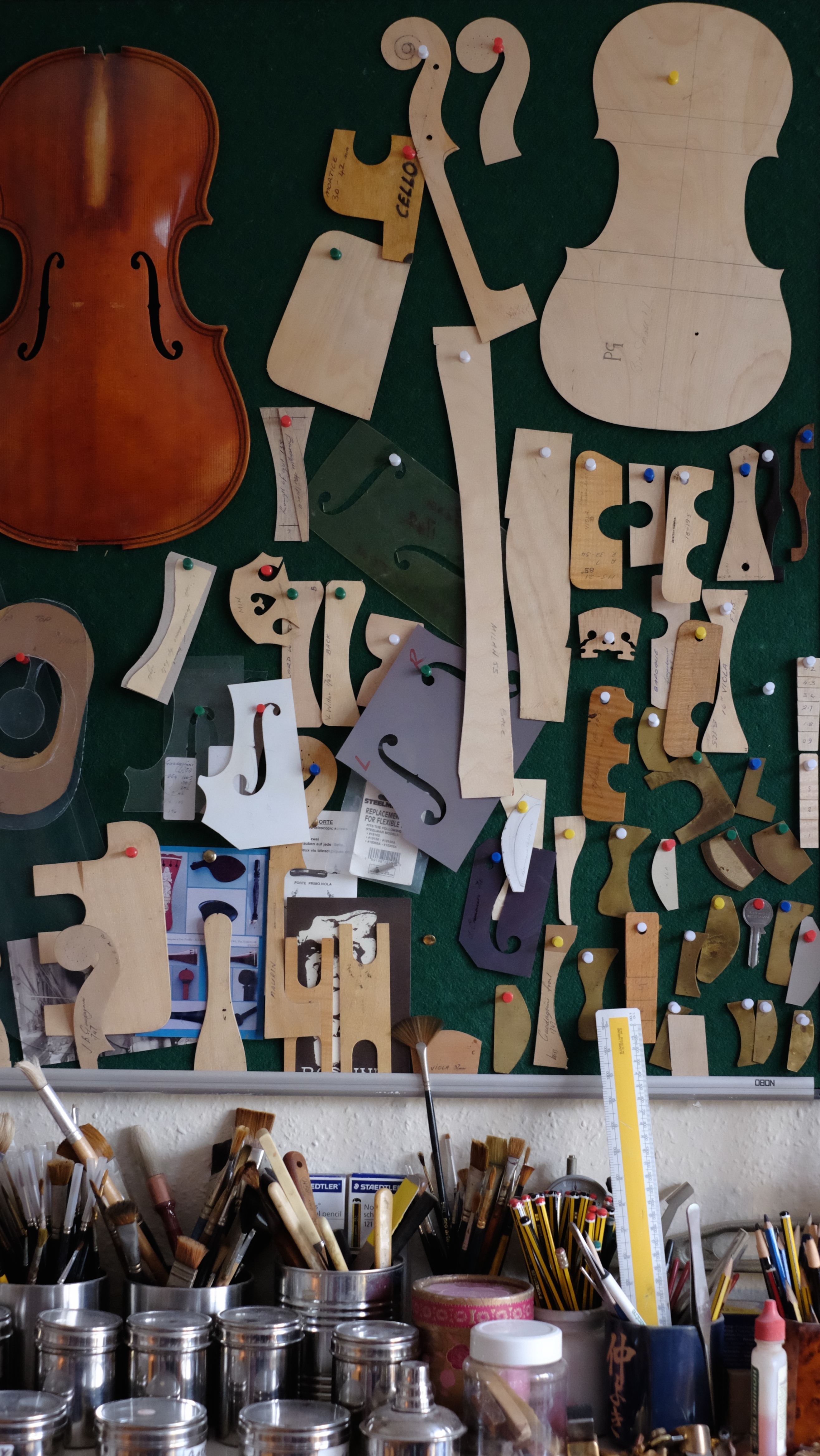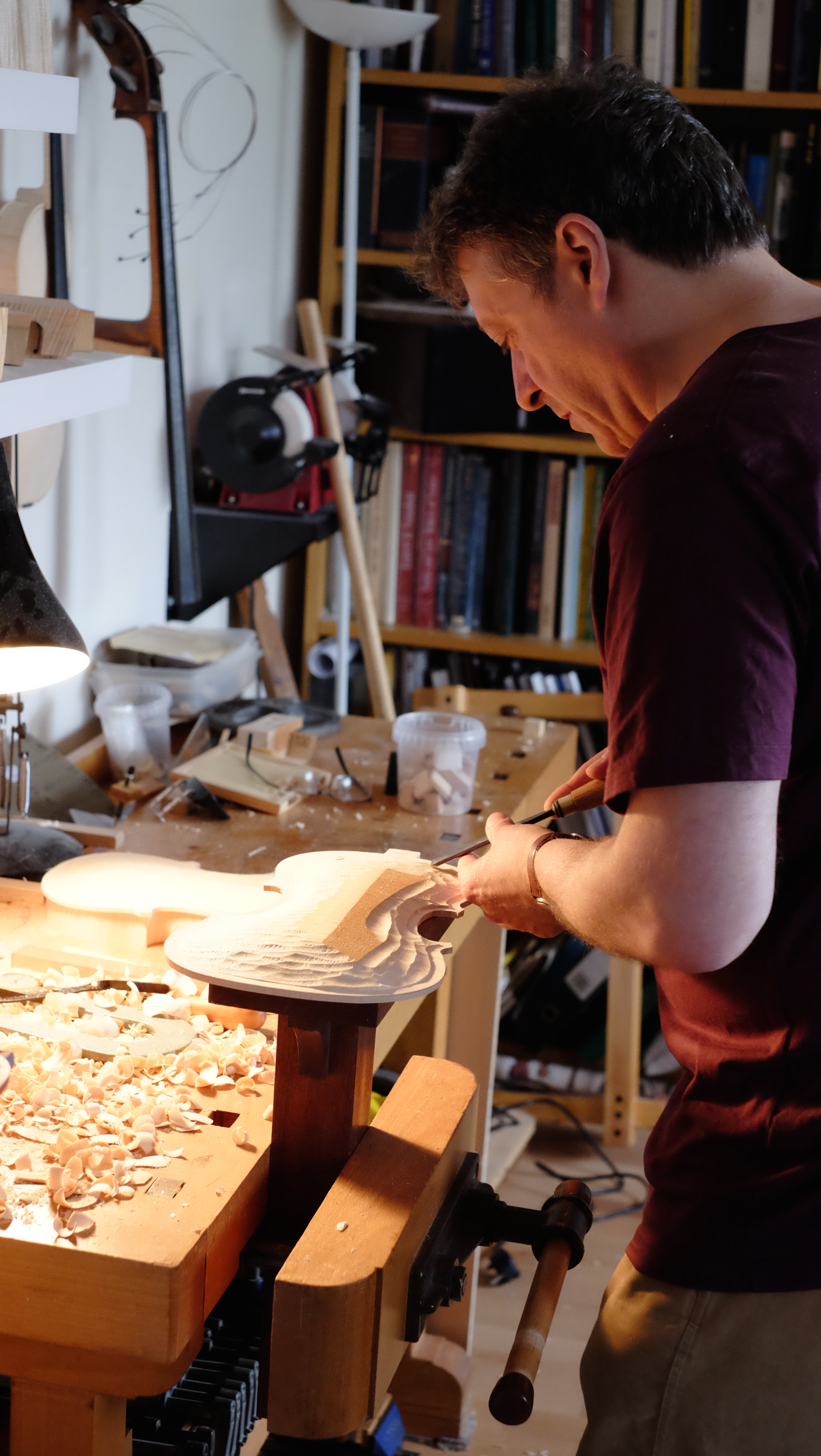 Once in a while, I take my fiddle back to its maker. This tends to happen at the time of year when I put the heating on and again at the other end of the year, when I turn the heating off. It is at these times, with changes in temperature and humidity that the instrument needs the TLC that only Jonathan can supply. This year I went to see him at the beginning of April and I decided to bring a picnic lunch with me. This I purchased at the truly fabulous Alamin shop on Mill Road. I bought samosa’s, rice and a spinach curry, oranges and chocolates for afters. Quite a feast. After lunch, while Jonathan worked, I took some photos of his studio.